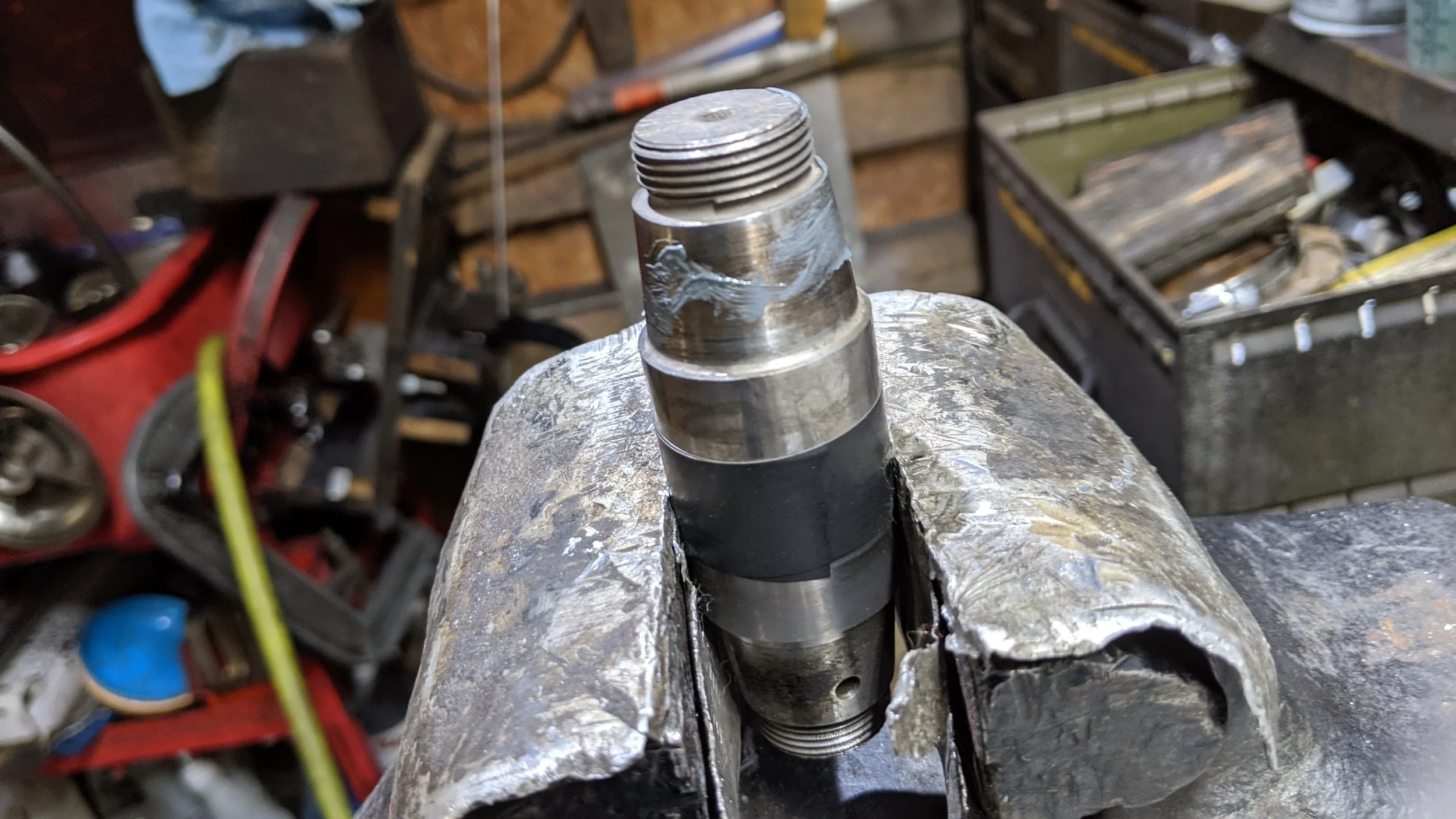An old used crankpin with good tapers. Will use to lap in flywheels. Note the step in the crankpin diameter, Flathead and “61” crankpins differ from 74 pins which do not have the stepdown is size.