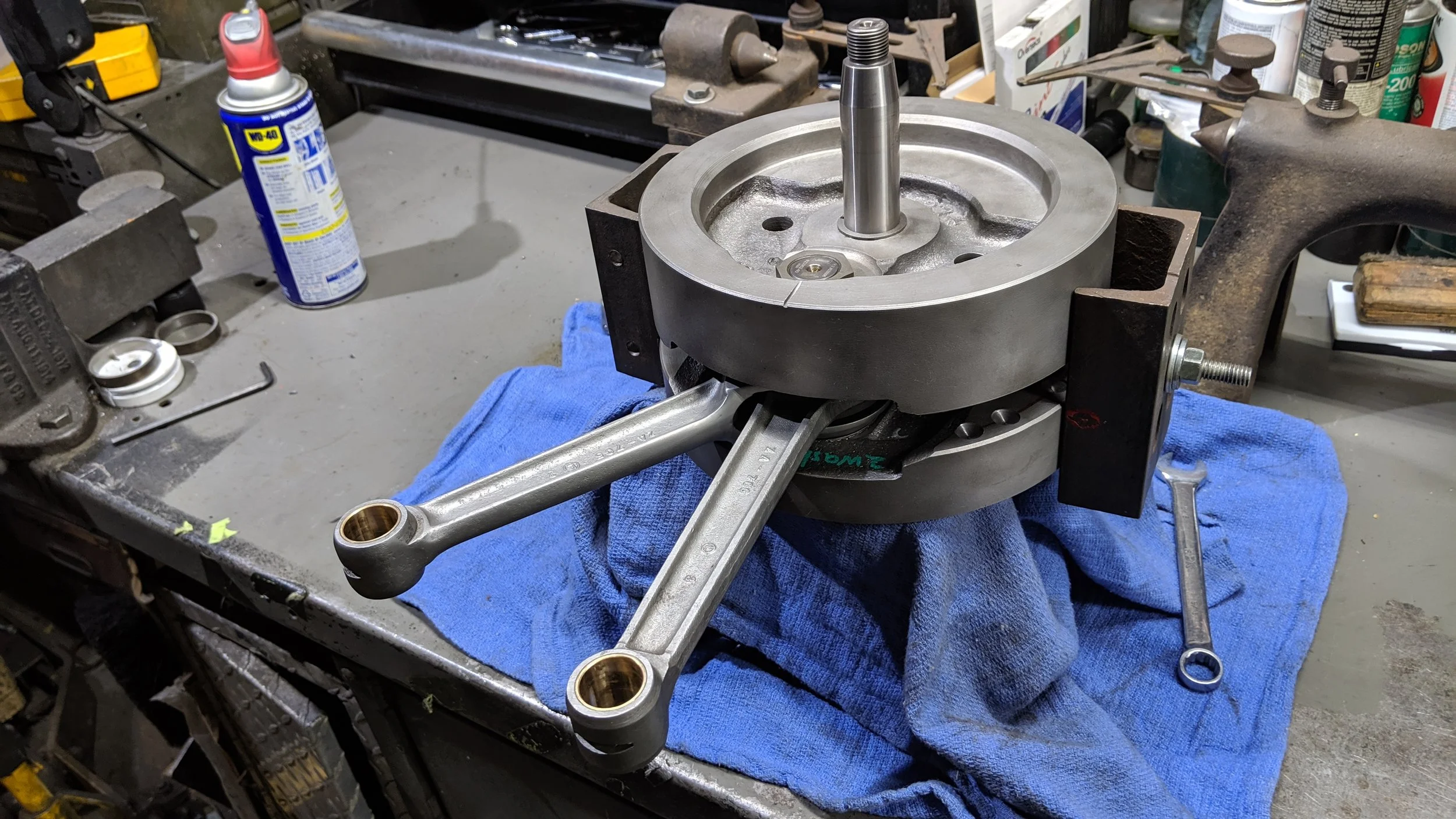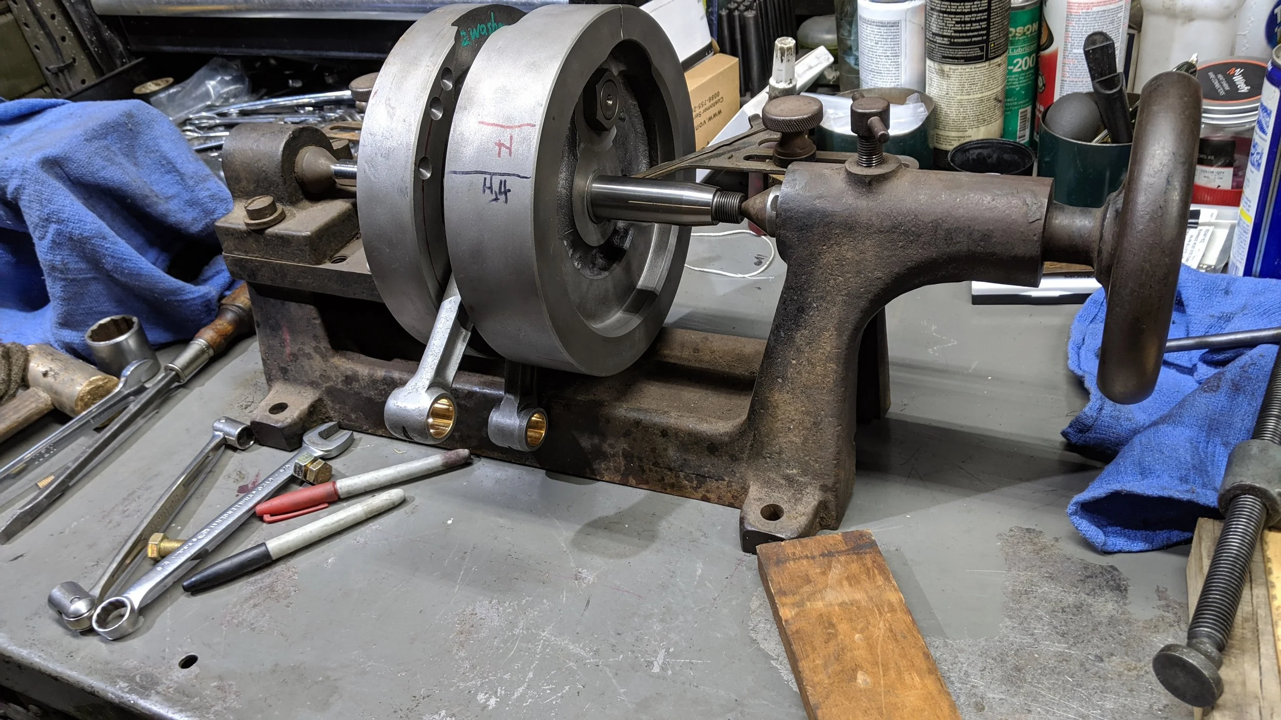Here are the flywheels in my ancient HD truing stand, I got it from a BSA dealership that closed down many many years ago. Have no idea where a BSA dealer got the Harley tool, but anyway it does the job. The markings on the wheels indicate whether the spot is high or low, and how many thousandths. You mark the hi spots, and then wack’em with your hide hammer (another harley tool) to get them in alignment. If you get both wheels pinched together in the same area, you need to spread them. A wedge is often used to do this, but I made a nifty little tool yesterday