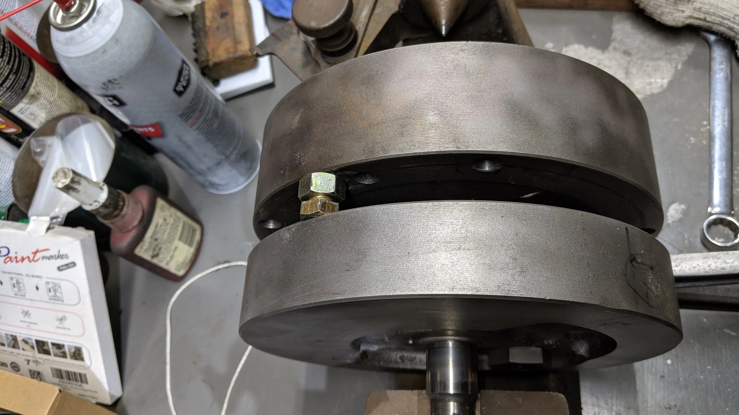 This is my wheel spreader tool, insert it between the flywheels, and turn the nut on the bolt so that they spread apart, and voila! it forces the wheels apart.